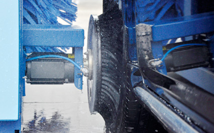 進口意大利塑玻絲輪刷,根據光電開關感應判斷車身位置,輪刷啟動至輪轂位置,開始清洗,正反旋轉刷洗輪轂,電腦洗車機全程電腦全自動控制輪刷伸縮。